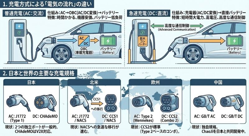 EVの充電には、主に「普通充電(AC)」と「急速充電(DC)」の2つの方式があります。電気がどのようにバッテリーまで届くのか、その仕組みは大きく異なります。
