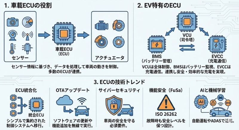 これらの技術は、ECUを自動車産業の変革の中心に据え、車両の進化を支え続けています。