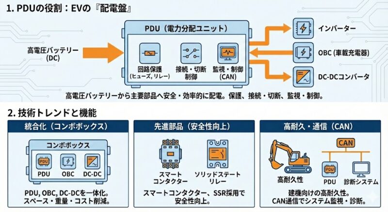 PDUは、OBCやDC-DCコンバータと統合し、「コンボボックス」として一体化するトレンドにあります。これにより、車両のスペース、重量、コストの削減が期待されています。