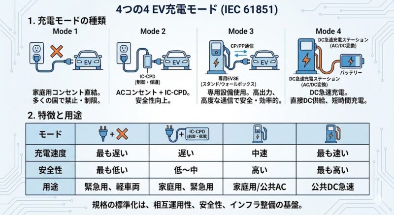 電気自動車(EV)の充電方法は、IEC 61851規格に基づき、安全性と充電速度によって4つのモードに分類されています。