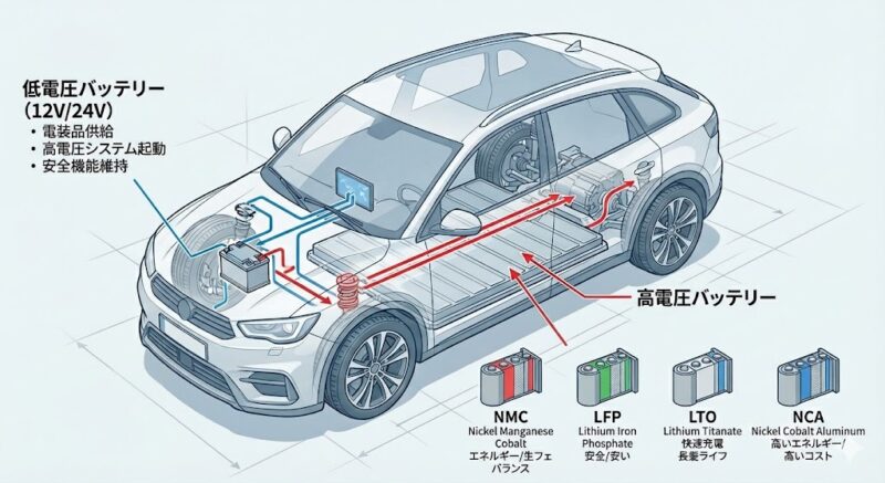 現代の電気自動車(EV)やハイブリッド車(HEV)は、走行用の高電圧バッテリーと、従来の電装品用の低電圧バッテリーの二つを搭載しています。