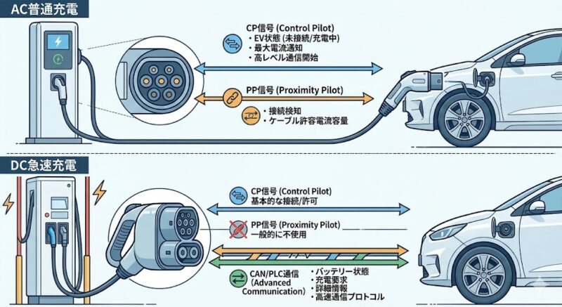 DC急速充電では、高電圧・大電流で直接電力供給が行われるため、CP信号とPP信号の役割は異なります。