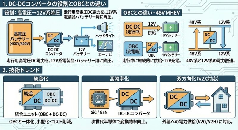 車載DC-DCコンバータは、電気自動車(EV)などに搭載されている重要な部品です。その主な役割は、走行用の高電圧バッテリー(例:400Vや800V)のDC(直流)電力を、ヘッドライトやカーナビなどの12V系の電装品が必要とするDC電力に変換(降圧)することです。