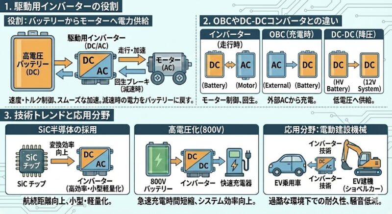 インバーターの性能、特に電力変換効率は航続距離に直接影響するため、技術開発が活発に進んでいます。