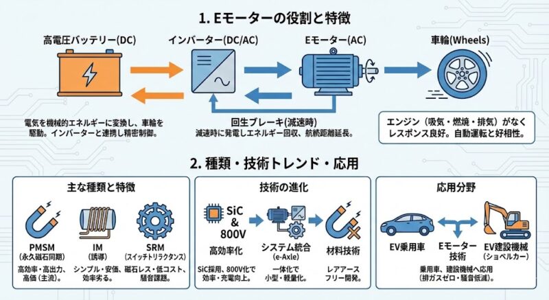 Eモーター(電気駆動モーター)は、電気自動車(EV)の駆動力を生み出す心臓部です。バッテリーからの電気エネルギーを機械的エネルギーに変換し、車輪を回転させます。インバーターと連携して、モーターの速度やトルクを精密に制御します。また、減速時には発電機としても機能し、回生ブレーキによってエネルギーを回収し、航続距離を伸ばします。さらに、Eモーター機構はエンジン機構と異なり吸気、燃焼、排気がない為、レスポンスがよく、自動運転との相性が良いです。