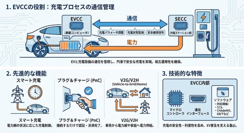 EVCCは、充電ステーション側のSECCというコントローラと連携して動作します。この連携により、異なるメーカーのEVが様々な充電器で充電できるよう、相互運用性が確保されます。